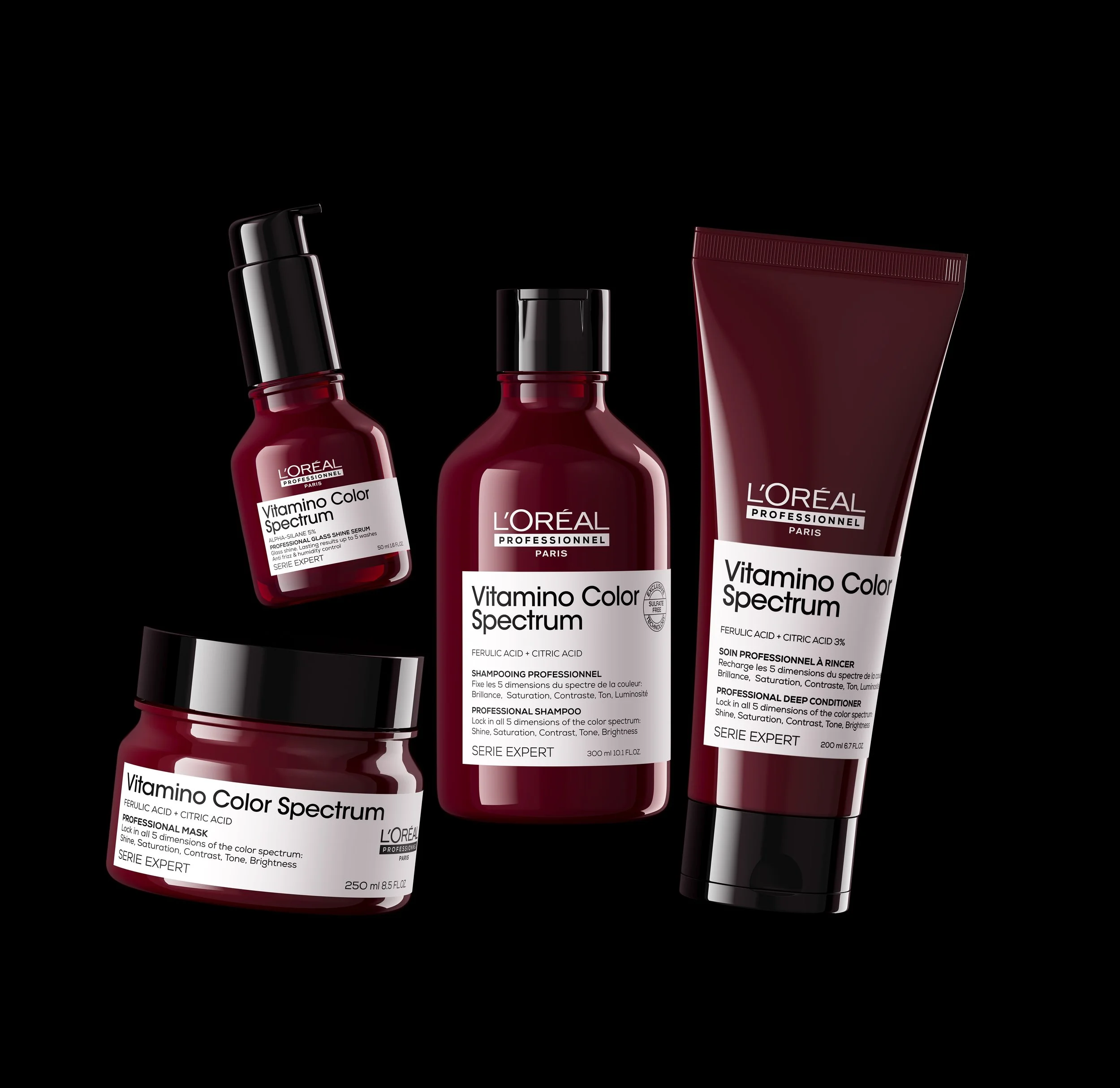 Vitamino Colour Spectrum is a professional colour-care system by L’Oréal Professionnel, designed to protect, preserve, and enhance the full spectrum of coloured hair - from blondes and brunettes to coppers, reds, and fashion shades.